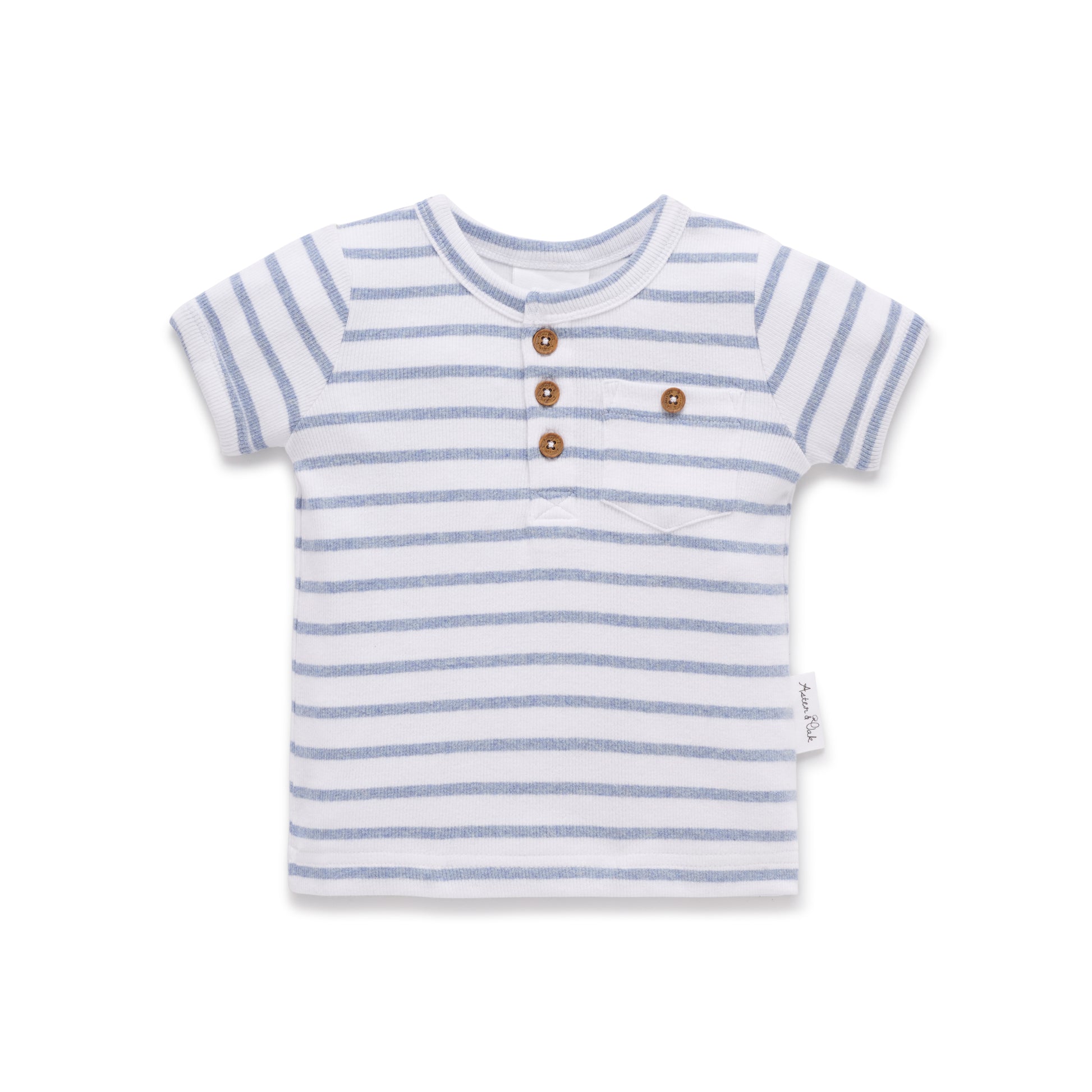 Made from GOTS certified organic cotton, this classic stripe tee features our henley neckline with wood look buttons and functional front pocket.