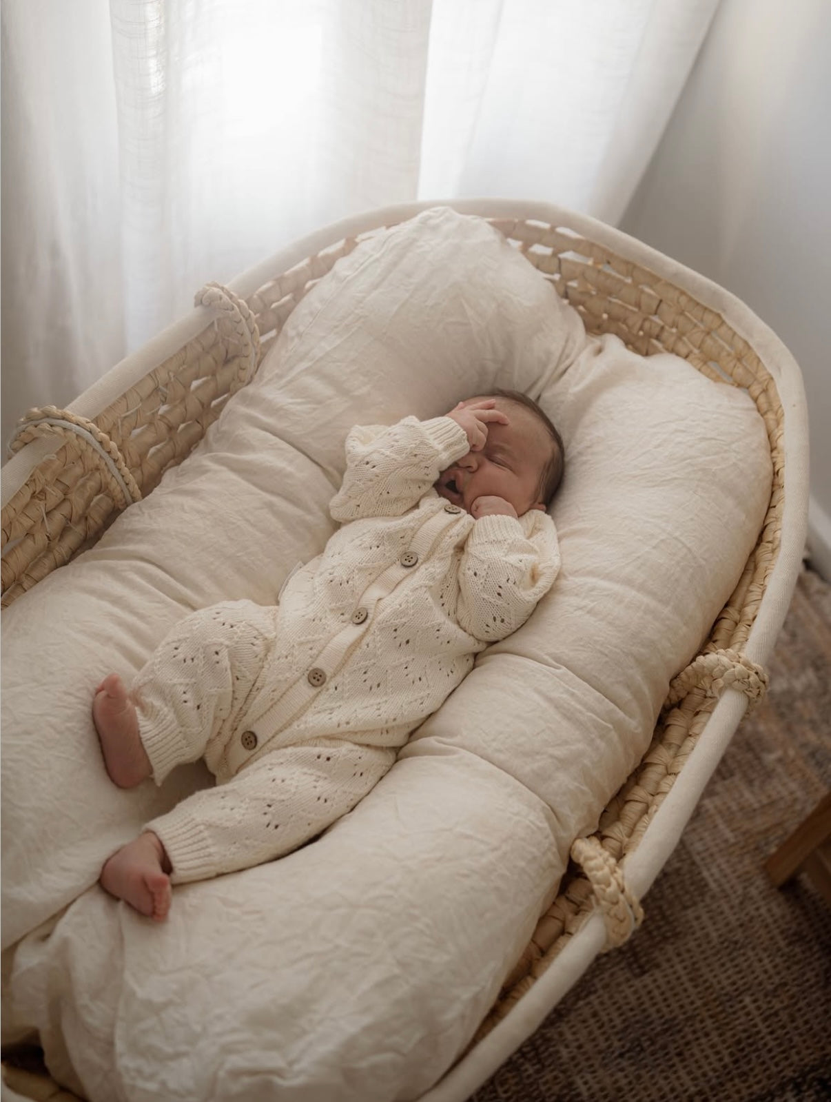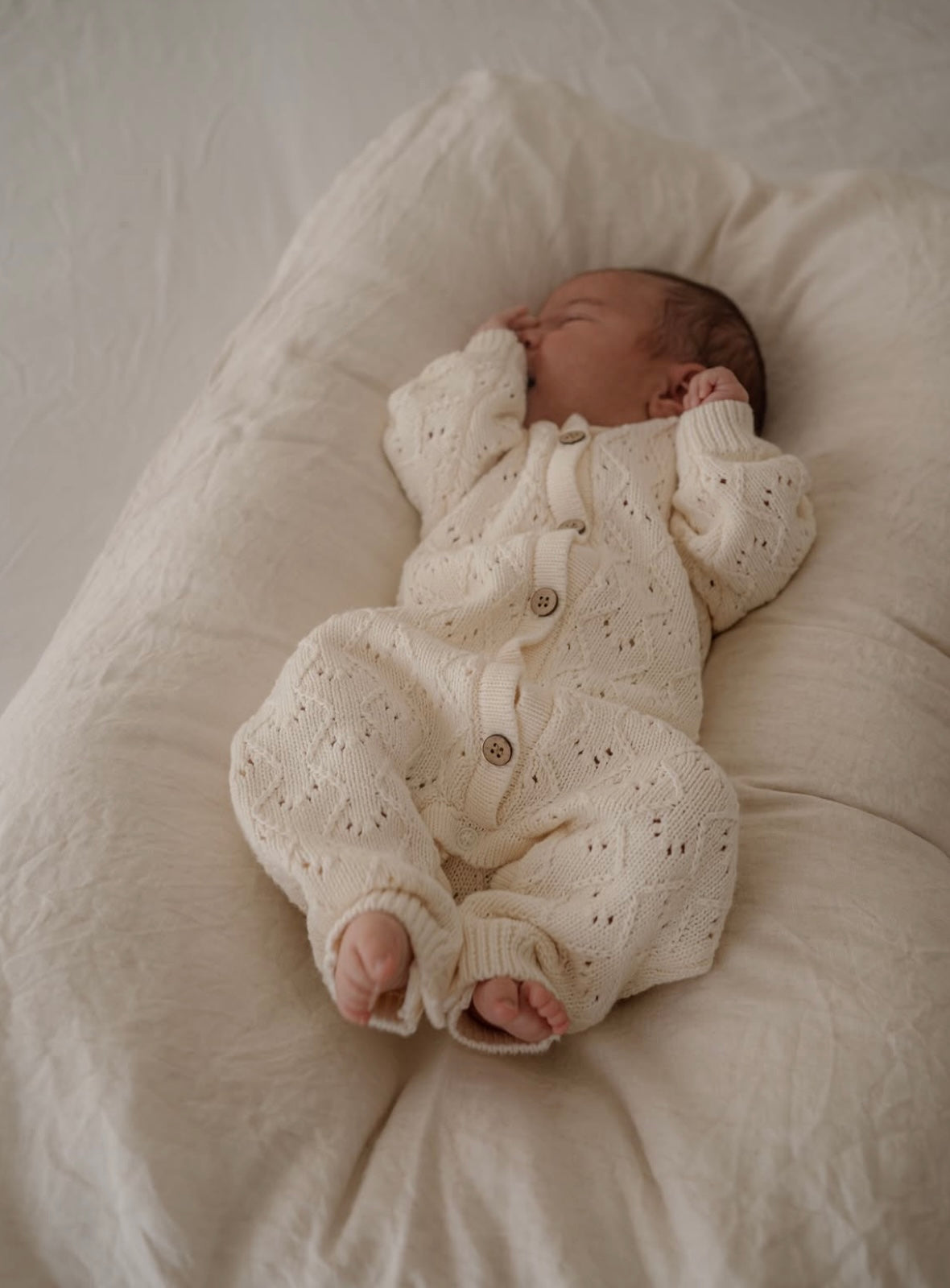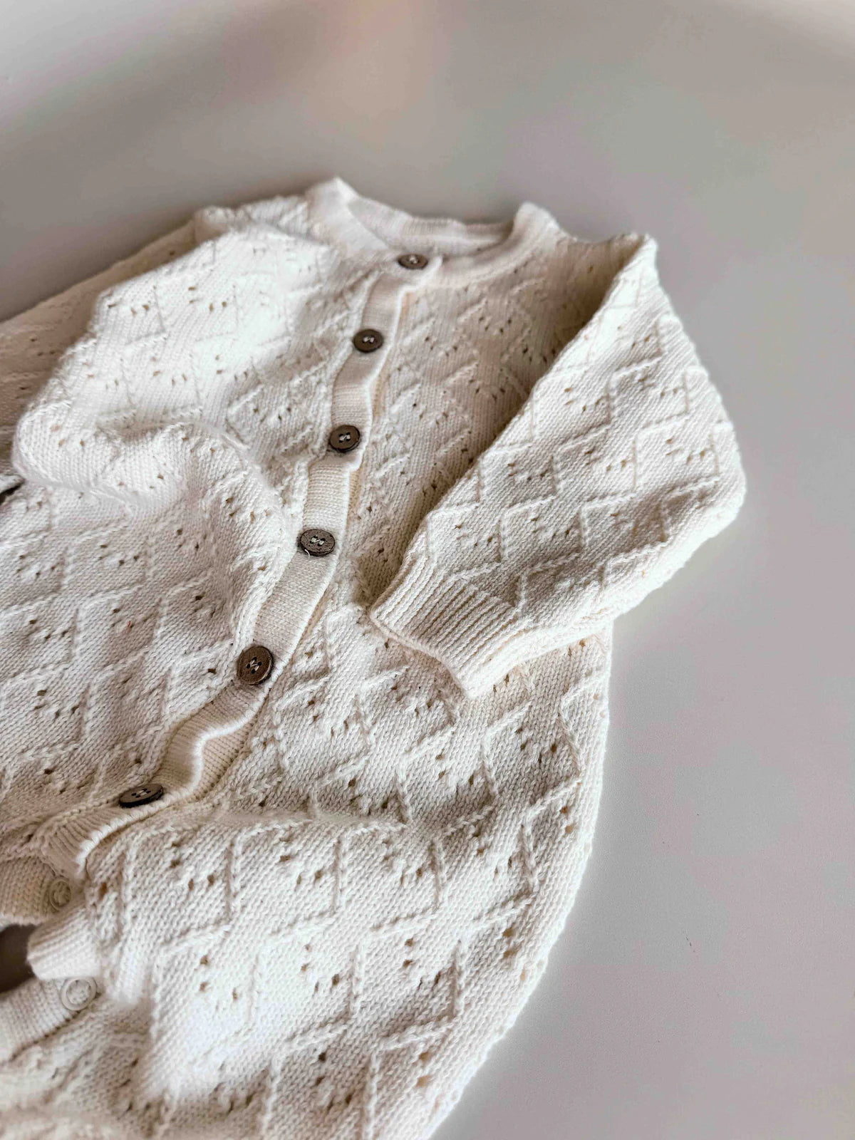 Our Mila Pointelle Full Romper is a classic piece beautifully knitted in our signature pointelle design. Perfect for baby's first outfit, special days, or photos, this romper is made to keep and treasure. Simple, pretty, and timeless.
