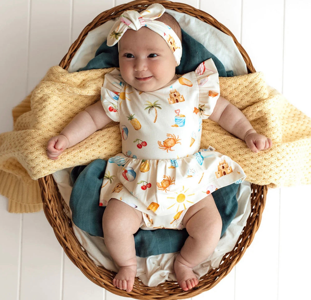 Soft and stretchy, our dresses are easy-care and very comfy for bub. The sizes up to and including size 1 come with a snap underbody to go over a nappy. Size 2 and up doesn't have the snap body feature. We have really focused on the details and ensured the dresses up to size 1 are short enough so that a baby can crawl and not trip over the skirt. Size 2 and over, when they're walking, is a bit longer.