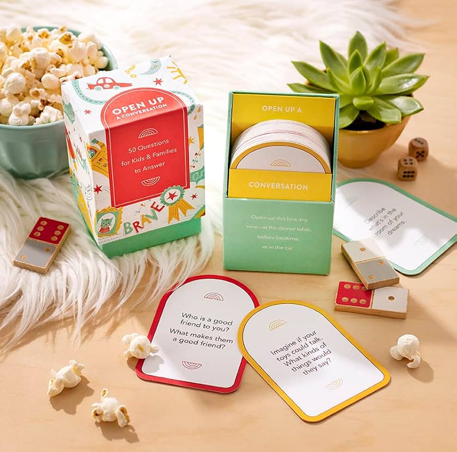Inside this box are 50 conversation starters — questions you can ask at the dinner table, before bedtime, or in the car.