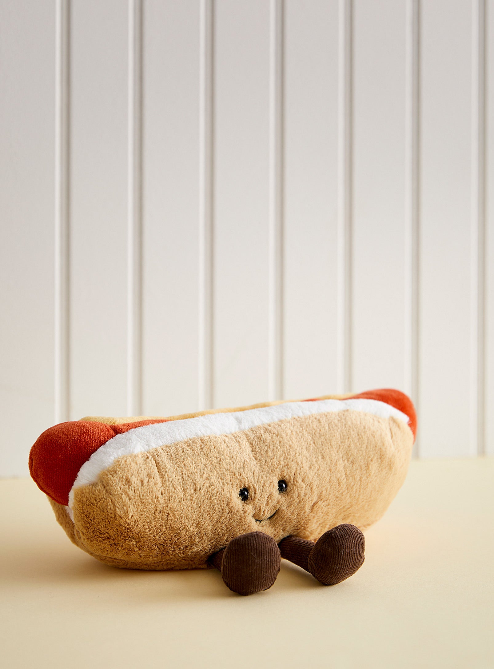 Anyone for a sausage sizzle? Amuseables Hot Dog features fluffy bread bun in beige and white plush and a frankfurter covered in yummy mustard, topped off with dangly cordy feet and cheeky smile.